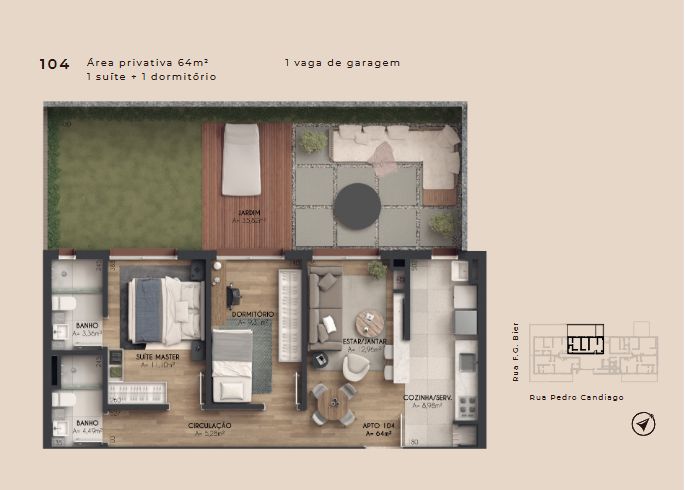 O apto 104 tem 64 m2 privativos 35,82M de Garden e 2 dormitórios( Sendo 1 Suíte). O residencial contará com uma infraestrutura composta por jardins, playkids, espaço gourmet, espaço fogo, espaço pet, pomar e bicicletário.