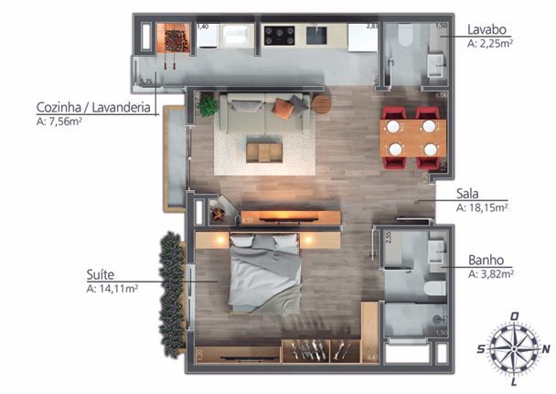 1 Dormitório, sendo 1 Suíte1 Banheiro1 Vaga