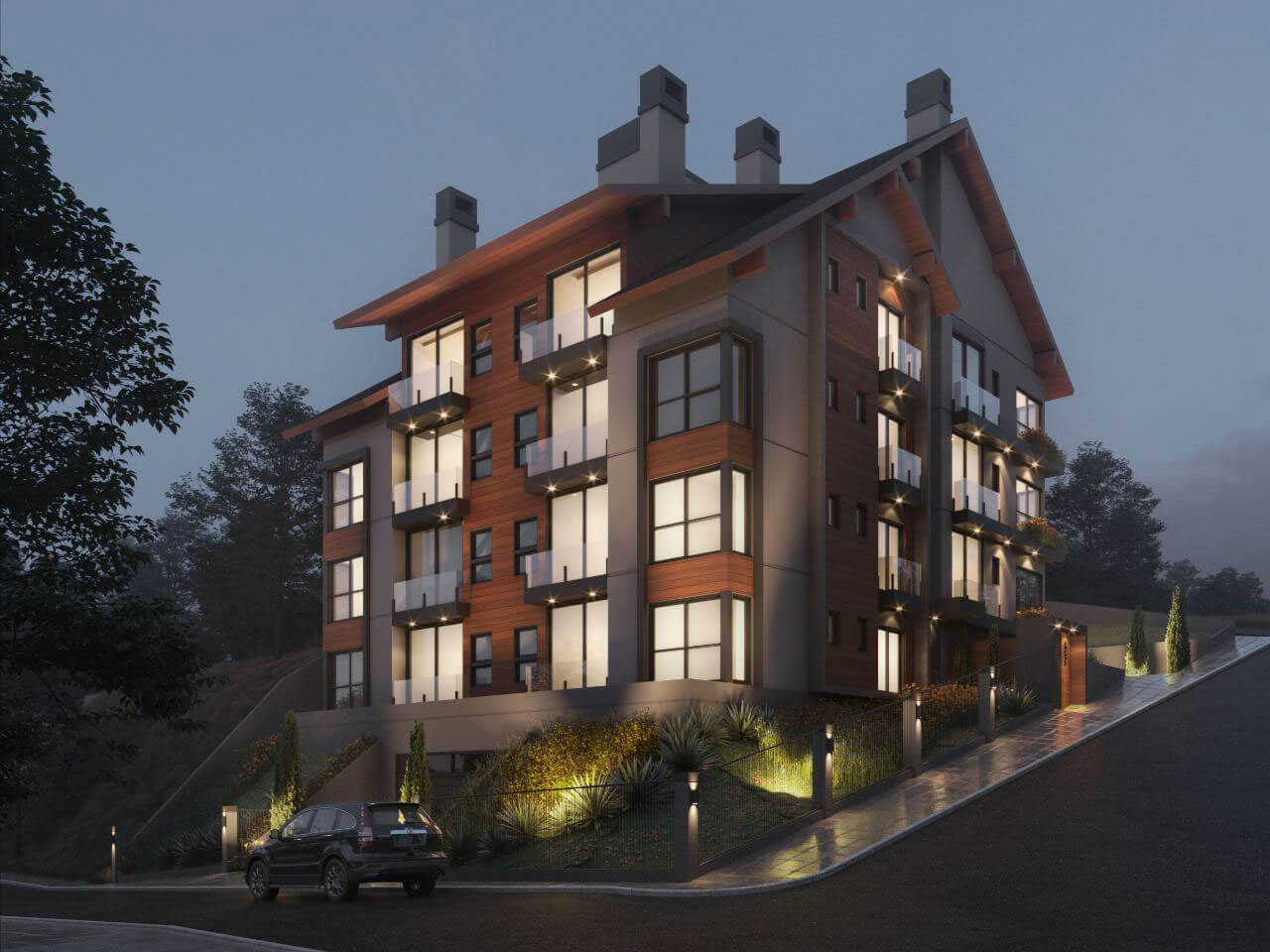 Contam com churrasqueira, esperas para calefação e lareira, esquadrias em pvc com perfil black, vidros externos duplos, forro em gesso em todos os ambientes, paisagismo com iluminação em led e reutilização da água da chuva