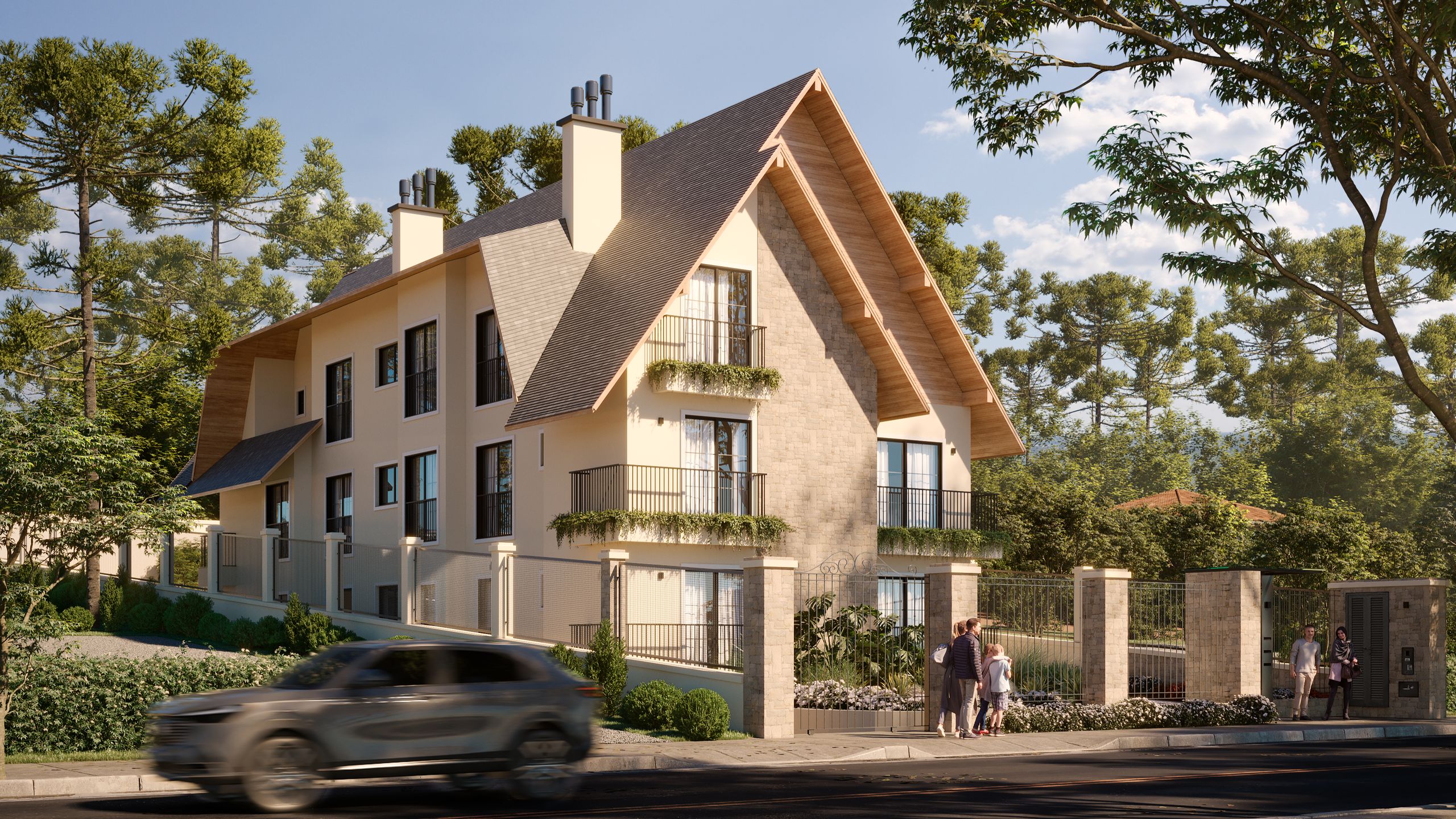 Prédio boutique, intimista com senso de casa. Inspirado nos design de mansões americanas, mantendo o charme e estilo da serra gaúcha, com apenas 6 apartamentos. O conceito do projeto é um residencial exclusivo, de poucos proprietários que buscam tranquilidade, qualidade de vida e proximidade com a natureza.