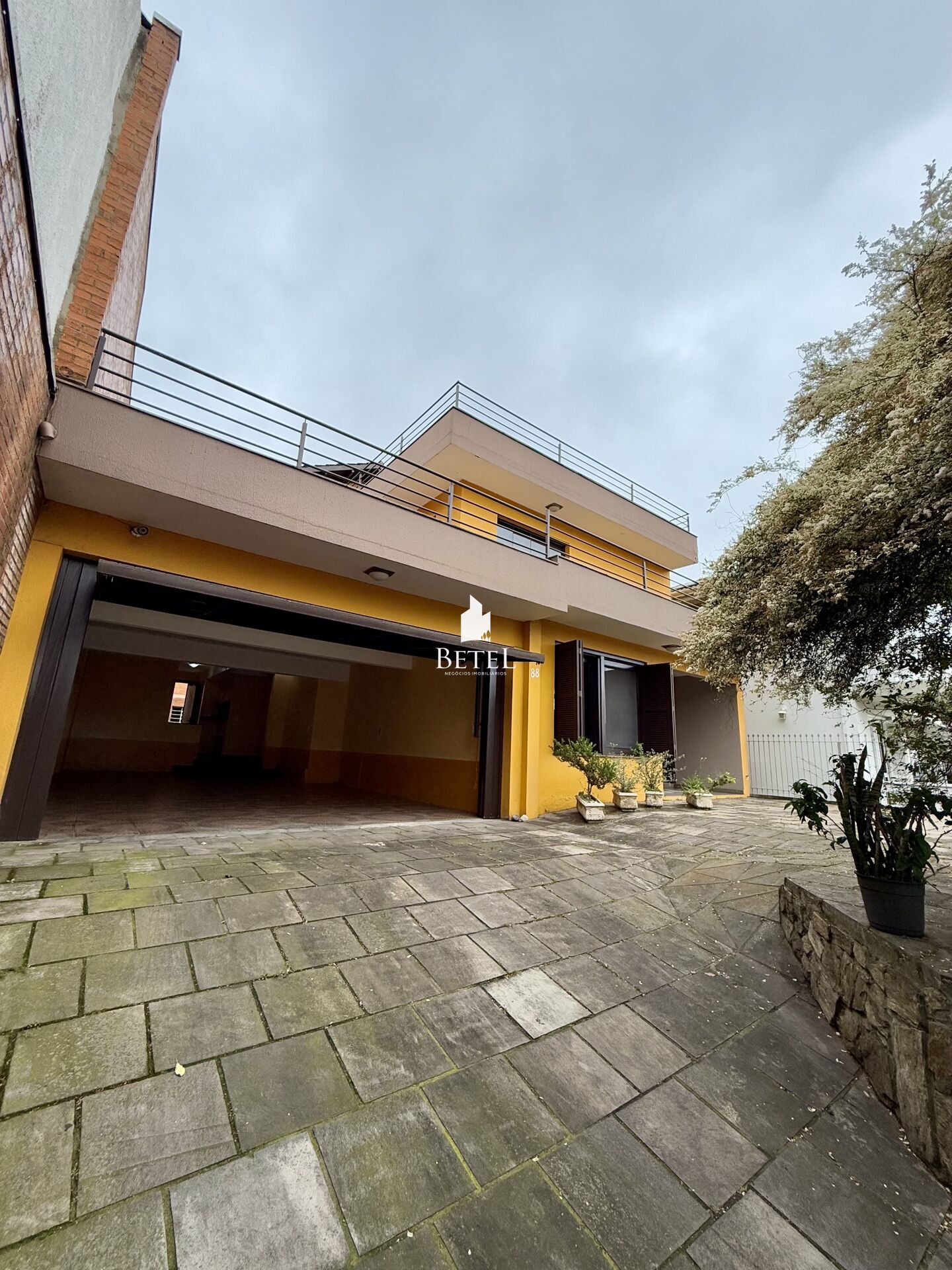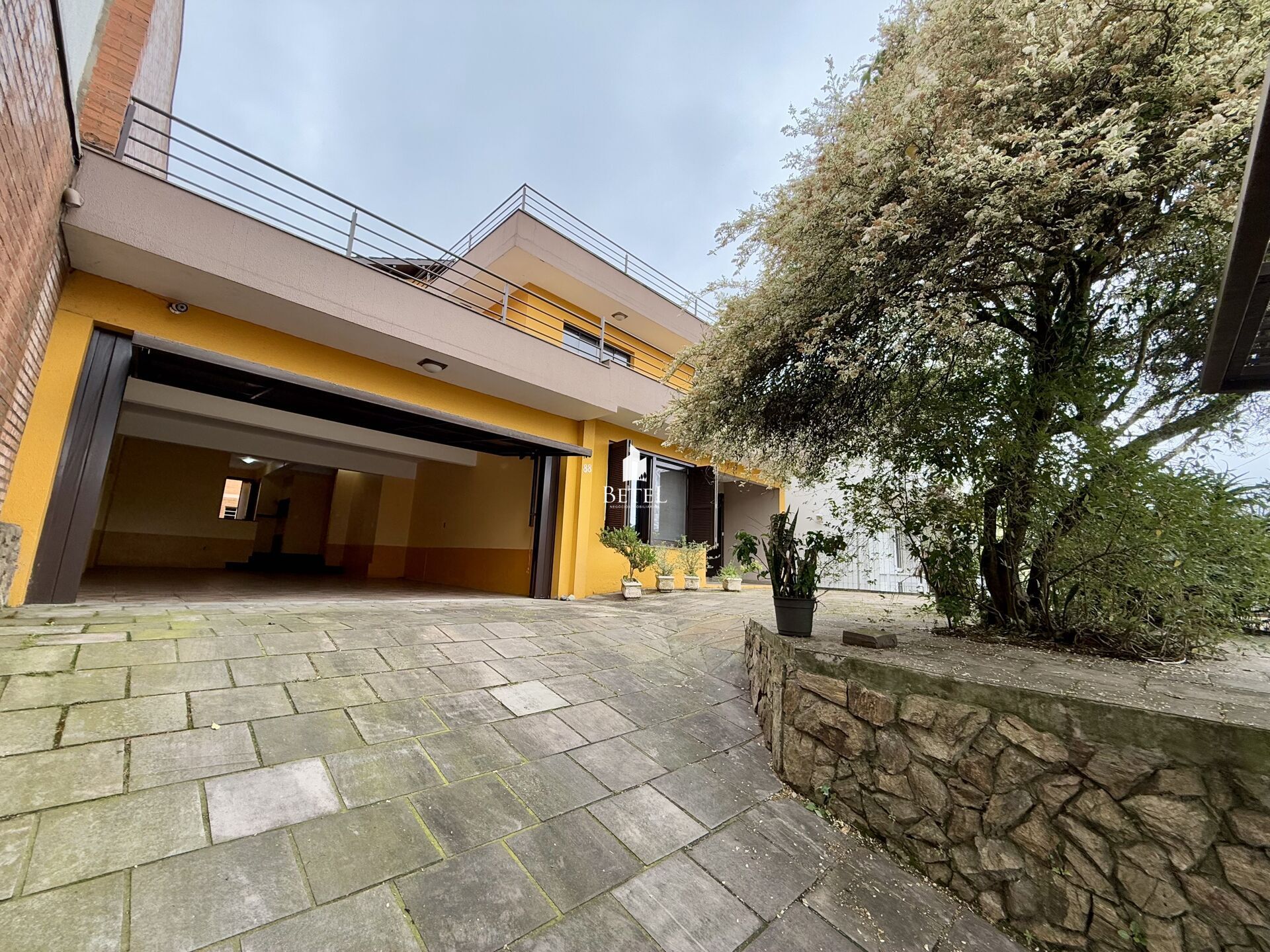 Betel Negócios Imobiliários vende: Casa semimobiliada contendo 2 (dois) pavimentos, localizada no bairro Charqueadas, medindo 356,21 m² de área total, dispõe de 3 (três) suítes sendo uma c/ ar condicionado, closet e banheira, 5 (cinco) banheiros sendo 1 (um) lavabo, despensa, cozinha integrada com ampla sala de jantar c/ lareira e espera para calefação, sala de tv e jogos c/ ar condicionado e amplo terraço, área de serviço, vaga de garagem coberta p/ 3 (três) carros, pátio aos fundos todo calçado, toda murada, portão eletrônico, 11 (onze) placas solares instaladas e uma edificação independente de 84 m² com dois pavimentos. No pavimento térreo encontra-se um ateliê e no superior há 1 (um) salão de festas, churrasqueira rotatória, fogão a lenha e banheiro social.