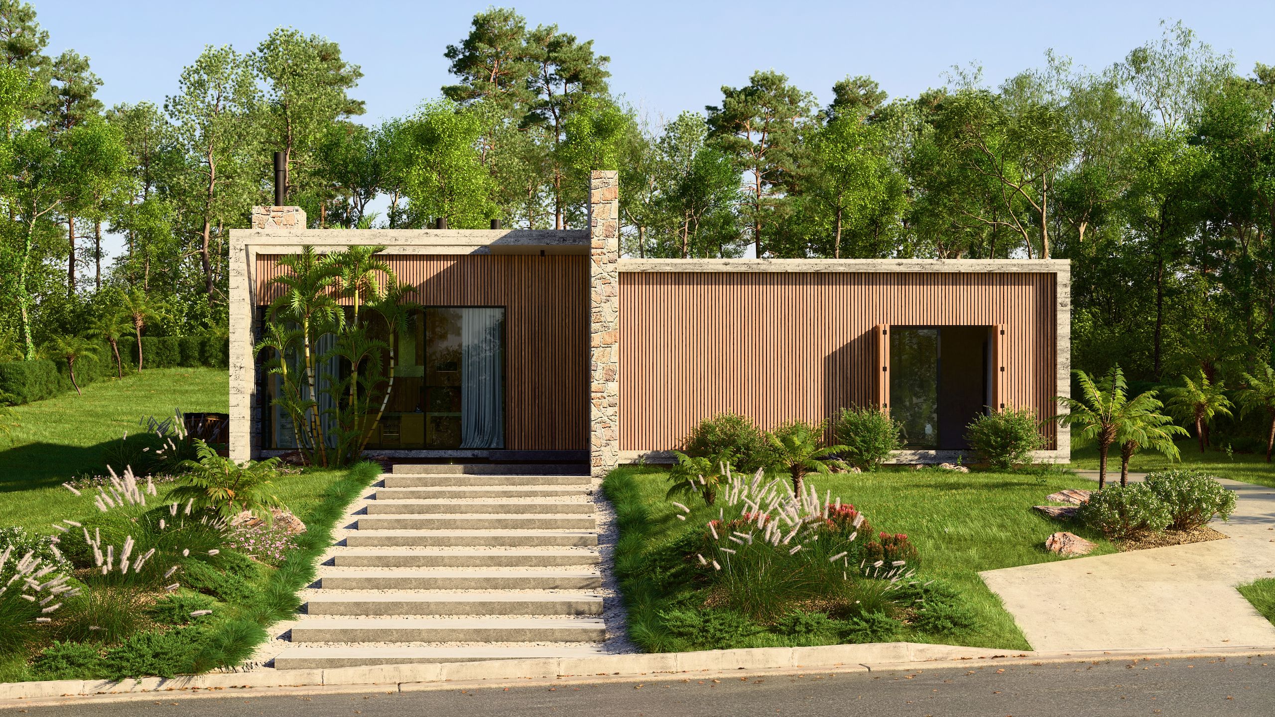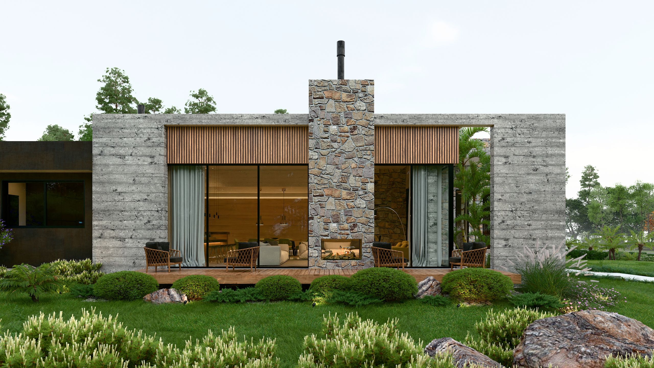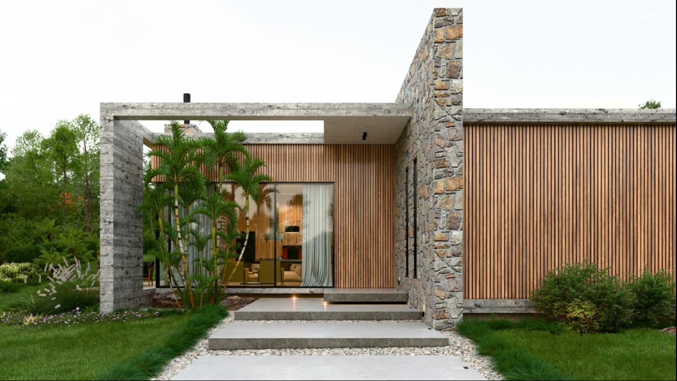 Um projeto que une o melhor da arquitetura contemporânea com a força da natureza através de uma combinação elegante de pedras, concreto e madeira.