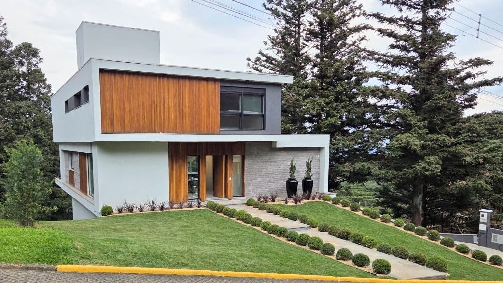 Com uma arquitetura moderna e linhas elegantes, a casa se eleva majestosa no topo de um morro, revelando uma vista deslumbrante para o verde do vale que a envolve.