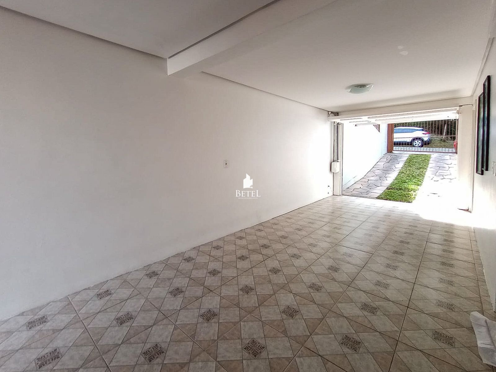 Garagem para 3 carros, área de serviço com churrasqueira e pátio nos fundos